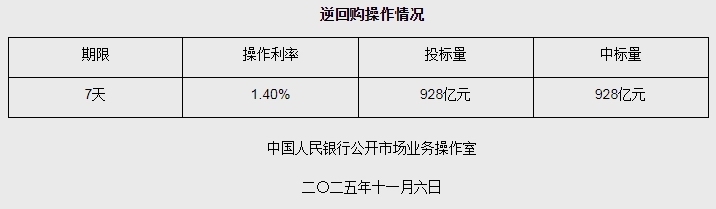 公开市场业务交易公告[2025]214号 2025年11月6日,中国人民银行采用固定利率、成交量竞价方式开展928亿元7天期逆回购操作。具体情况如下: