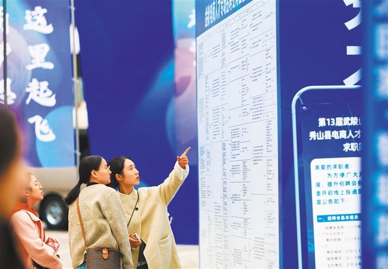 11月7日,在重庆市秀山县武陵山(秀山)国际电子商务产业园,求职者在2025秀山县“秀才回乡·智联跨境”金秋电商人才招聘会上查看岗位信息。胡成 摄(中国经济视野)10月25日,河北省秦皇岛市燕山大学,应届毕业生在“职业引领未来——全国城市巡回招聘(燕山大学站)”活动中了解就业信息。此次活动汇聚了全国500多家单位,提供了3000多个就业岗位。曹建雄 摄(中国经济视野)10月31日,江苏省宿迁市泗洪县重港街道经济经济班格威尔培训下班,学生们了解无人机的实际操作和应用场景。低层经济作为战略性新兴产业,为经济发展和就业增长提供了新动能。张连华 摄(中国经济视野)10月26日,选手们在安徽省淮北市参加淮北工学院直播电商技能大赛。当地不断加强电商人才队伍建设,推动电商直播高质量发展。刘奇 摄(中国经济视野)11月1日,湖北省荆门市青年人才“招聘夜市”上,应聘者与企业现场连线。近年来,针对年轻人多样化的就业诉求,当地政府推出了“带你回家”、“招聘人才”、“招聘夜市”等特色就业服务品牌。赵平 摄(中国生态经济视野)11月5日,贵州省金平县三江镇大工田村一家电子公司,工人们正在作业。金平县在移民社区开设“移民就业坊”,让居民在家门口找到工作。杨晓海(每日经济日报)摄(本文来源:经济日报)