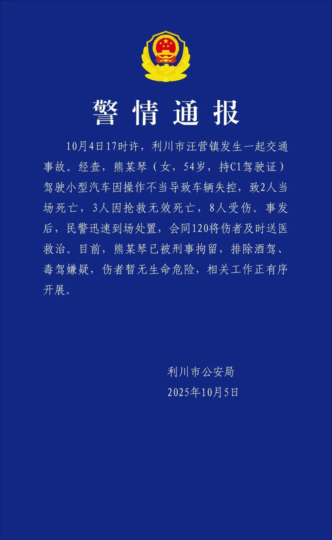China News Service, October 5. According to the Wechat public account of the Lichuan Public Security Bureau, the Lichuan Public Security Bureau of Hubei Province released a police report on 5, saying that a traffic accident took place in Wangying Town, Lichuan City at 17:00 pm Oct After the investigation, Xiong Mouqin (female, 54 -year -old, with a C1 driver's license) pushed a small car due to improper operation, causing该地区有两个人死亡,三人死于无效的救援,八人受伤。图片来源:在莉古安市政公共安全局的微信公共帐户之后,警察迅速到达现场处理这种情况,并与120人合作,及时将受伤的人送往医院接受治疗。目前,Xiong Mouqin被困在罪犯中,并被排除在涉嫌醉酒的驾驶和毒品驾驶。受伤的人尚未处于生命的风险,相关工作是正确执行的。