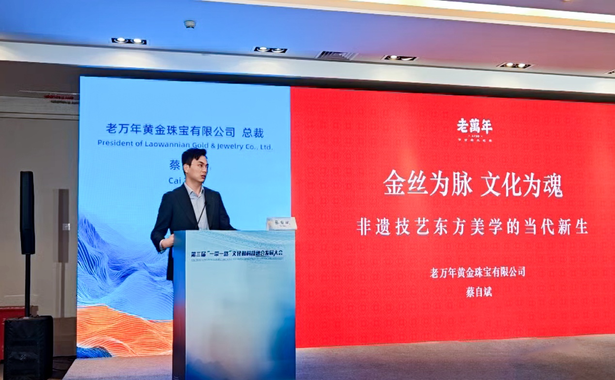11月18日,第三届“一带一路”文化科技融合发展大会在北京昌平举行。本次会议由丝绸之路规划研究中心、中国民间组织国际交流促进会、民盟中央文化委员会、中国艺术科学技术学院、中央财经大学主办。以“国际视野下的人工智能+文化科技新生态”为主题,来自15个国家的400余名代表齐聚一堂,共同探讨创新驱动发展、文明互鉴、文化科技共同发展。老万年董事长阿普罗西·子斌先生受邀出席出席大会并在以“金线为脉、文化为魂——非遗技艺与东方美学的当代重生”为主题的“文化架起丝路,合作谱写新篇章”论坛上发表主旨演讲,分享了新时代背景下如何激活非遗活力、打造东方美学的实践与思考。蔡子斌院长在致辞中首先回顾了中国非物质文化和文化遗产面临的机遇和挑战。他表示,虽然中国国家级非物质文化遗产项目多达3610个,但遗产普遍面临地域限制、传播能力薄弱、营销品牌推广不足等挑战。他强调:“有效的文化传播不仅需要深厚的内涵,更需要贴近生活的载体和路径。蔡子斌通过对比国际品牌通过持久的品牌叙事将文化转变为全球符号的成功案例,蔡子斌指出,中国品牌在系统化、国际化的打造与传播上仍有提升空间。他认为,“国潮复兴”带来了历史性机遇。从《哪吒》、《黑神话:悟空》到城市文化和敦煌文化的禁制创作,一系列引人入胜的案例表明,中国传统文化的融合他接着说,中国黄金珠宝行业的发展也体现了这种趋势,从早期的港资品牌到内地品牌,传统的品牌、产品和叙事模式虽然有市场,但都是以卖产品、卖节日、卖价格为主。他们普遍缺乏文化底蕴和品牌印记。如今,一批创新非遗实践、注重文化内涵和产品独特性的“古金品牌”正在逐步改变这一格局。技术和人工智能还在产品设计、文化传统技术的无形创新以及提高生产力方面提供了重大帮助和突破。面对这个时代的机遇和挑战,老万年的回应是“金线为脉、文化为魂”的创新实践。 “金丝为脉”体现了对“金银精工”和“金银丝镶嵌技术”两项苏联非物质文化工艺遗产的继承和坚持,同时结合现代科技方法和工具进行创新创造; “文化为魂”从传统东方元素和中国哲学中汲取灵感,打造“可穿戴”“久运”、“东方韵·西美”等新产品系列表达了非物质文化遗产实践与东方文化的融合,诠释了老万年打造东方传承高端品牌走向世界的战略。老万年在产品创新之外,正在积极构建更广阔的文化平台和生态系统。蔡子斌介绍了老万年黄金博物馆作为沉浸式多元文化的实践黄金周期间推出的“丝路文化研究院”,系统梳理丝路黄金文化遗产,努力向世界推广中国黄金文化和非物质文化遗产实践。与各方共同打造具有全球影响力的国家级高端品牌集群和文化交流平台,助力新时代丝路文化交流的繁荣发展。此次分享不仅为“一带一路”框架下文化交流提供了企业实践范例,也展现了百年民族品牌积极参与国际对话、诚信创新促进文明互鉴的责任与愿景。