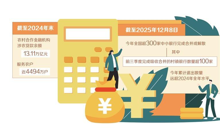 今年以来,中小银行兼并重组步伐加快。 Wind数据显示,截至2025年12月8日,今年全国已有300多家中小银行完成合并或解散。其中,前三季度完成并购的村镇银行超过100家,今年累计退出数量超过2024年全年水平。为什么中小银行退出数量多?转型后如何更好地赋能实体经济?兼并重组加速近期银行机构兼并进程与以往不同,一些新特征明显:一是大型商业银行进入“村办”方式,二是农村信用体系改革进程加快。村镇银行改革持续推进,大型银行积极参与n “村支行改革”,将村镇银行改为分支机构。例如,工商银行、农业银行作为主发起行获准收购村镇银行并改制为分行,有效填补了国有大型银行“村支行”战略的空白。今年6月,金融监管部门批准工商银行收购工商银行重庆璧山村镇银行并设立工商银行重庆璧山中央大街支行。看似常规的安排,却是大银行“村改”的罕见案例。数据显示,到2024年,总计将削减99家村镇银行,占全年银行机构削减总量的近50%。重组取得了惊人的成果。李光子 中国金融研究所银行业研究室主任社科院院士伊内塞表示,目前还有少数国有大型银行设立的村镇银行,主要集中在中国银行。中国银行通过中银富登村镇银行集团负责运营,其他多家大型国有银行持有的村镇银行数量很少。与此同时,除了大型国有银行外,村镇银行也与其他股东频繁交手,“村改”涉及到各股东之间的利益协调。国有大型银行决策链条长,分支机构业务水平高。村镇银行改制为分支机构后,应尽快统筹规划,整合村镇银行业务。近年来,农村信用改革在多方面呈现出百花齐放之势。不少地区成立了省级商业银行或村镇联营商业银行,并建立了多家银行。大量中小银行被合并为统一的省市法人银行。国家金融监管总局近日下发《关于设立新疆农村商业银行股份有限公司备案的批复》。并同意筹建新疆农村商业银行股份有限公司。此外,今年内蒙古、吉林等地区加快农村信贷改革,中小金融机构组建整合加快。中国银行业协会发布的《2025年全国农村中小银行机构行业发展报告》显示,截至2025年8月,已有11家省级合作社完成省级法人机构设立。其中,浙江、山西、广西、江西6个省采取联行模式开业; 5省, 辽宁,海南、吉林等地均采用统一法人银行模式,或由商业人开设营业。国家监管总局和金融监管总局近日披露的《银行业金融机构法人名单》显示,截至2025年6月末,我国村镇商业银行数量为1505家,比上年末减少58家;农村合作银行20家,减少3家;农村有农村合作社401个,减少57个;互惠基金合作社15家,减少57家。银行减少6家;村镇银行1440家,减少银行98家。半年以上五类农村金融机构合计减少222家。推进“村改”和农村信用机构改革具有深厚的历史背景和现实意义。中小银行致力于内涵式发展通过深化精细化管理、强化人才和技术支撑、推进分支机构轻量化、智能化转型、构建坚实的数据安全防护体系,不断探索更高质量、更好效益的发展道路。苏州商业银行特约研究员薛红艳表示,通过整合提升服务效率和风控能力,是适应监管政策、应对各大银行竞争的必然选择。改革的重要性可以从多个维度看出:通过全方位强化“技术+人才+管理”,促进资源优化整合和能力整体提升;优化了金融布局,提高了县域金融稳定性,为发展更加完善的农村金融服务体系奠定了坚实基础。本地配送中小银行经济因农业而发展。支持农业和小企业是他们的主要责任。此次改革重组最终是为“三农”提供扎实的金融服务。近年来,金融监管部门出台相关措施,引导中小银行成为支持农村和小企业的主力军,发展乡村振兴银行特色,不断完善涉农金融服务。国家金融监督管理总局办公厅印发的《关于巩固2025年“三农”金融工作的通知》明确,各金融监管局要结合辖内情况,坚持中小村镇银行支农支小定位。坚持以化风险促发展,引导地方法人银行科学制定多元涉农普惠贷款增长目标。以收购合作金融机构(资产规模占银行总数96%的中小银行)碧兰为例,到2024年底,各类机构涉农贷款余额将达到13.11万亿元,服务近4494万户农户。中国普惠金融研究院研究员张晓峰表示,增加信贷供给对促进乡村全面振兴具有多维度的关键作用。这既是破解农村发展资金瓶颈的关键途径,也是激发农村内生动力、实现城乡协调发展的重要支撑。 “但是,由于自然灾害、市场波动等诸多风险,农业生产过程中,与农业相关的各类企业(包括农户、小微农业企业)普遍缺乏高价值抵押品(如房产等风险)。天眼查数据研究院研究员陈哲认为。为提高融资对接的精准度和便利性,不少地区建立“政银企”链接平台,扫清融资障碍,持续降低经营主体融资成本和风险。在山东,银行联合推出了为创新企业提供担保的融资担保推出担保创业贷款,让创业者线上直连无需等待贷款 在四川,银行机构深化与眉山产业投资有限公司的合作,通过应急资金、风险补偿基金等方式,拓展小微企业和小微企业的金融服务场景。RO企业根据不同行业的特点,缓解资金周转问题。 “通过政府、银行和企业之间的合作,中小银行可以增强信誉。提高贷款服务的准确性,挖掘新客户,降低风险影响。”张晓峰表示,地方法人在着眼地方业务的同时,《国民经济和社会发展第十五年规划纲要》提出,提高重点领域防范化解风险能力,组织推进地方政府、中小金融